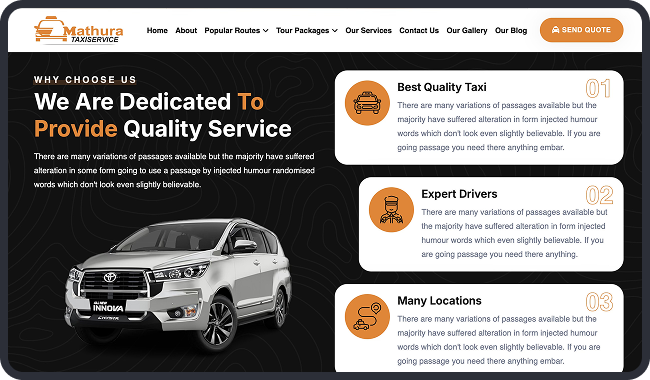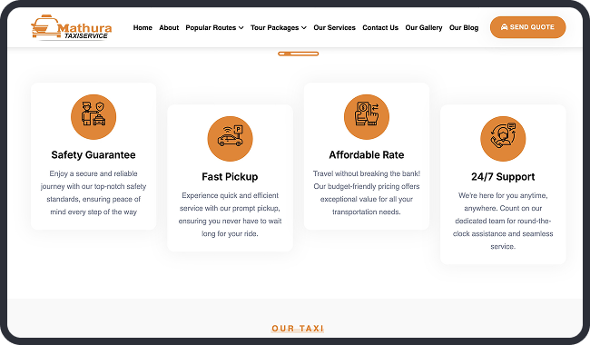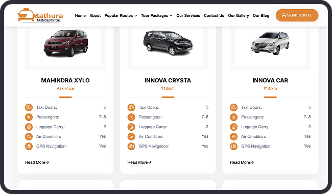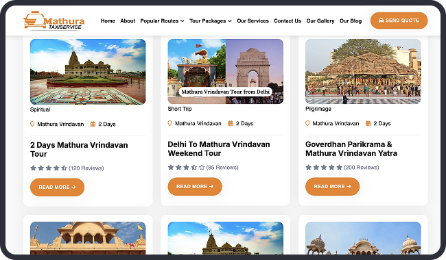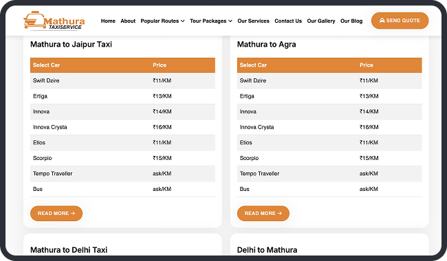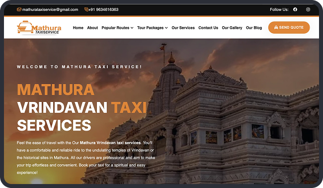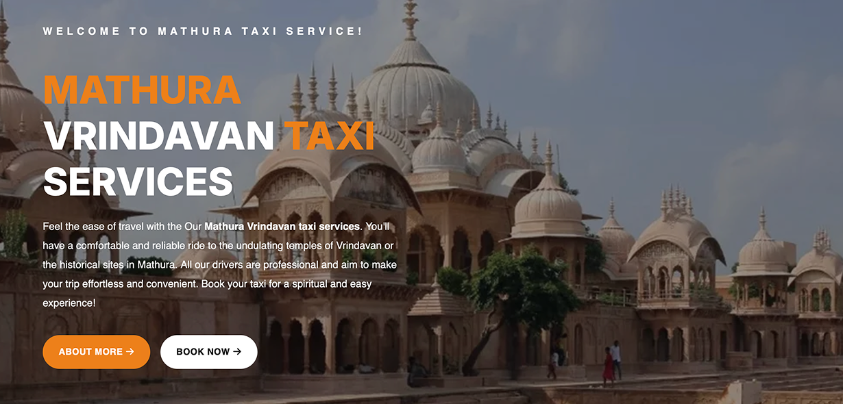 Mathura Taxi Service, a leading provider of reliable taxi and car rentals in Mathura, India, approached us to develop a comprehensive website to streamline their operations and enhance customer engagement. With over 10 years in the industry, the client specializes in comfortable transportation for spiritual pilgrimages to Vrindavan temples, city tours, airport transfers, and outstation trips to destinations like Delhi, Agra, and Jaipur. The goal was to create a user-friendly platform that simplifies bookings, showcases their diverse fleet—from sedans like Swift Dzire to buses—and promotes customized tour packages.